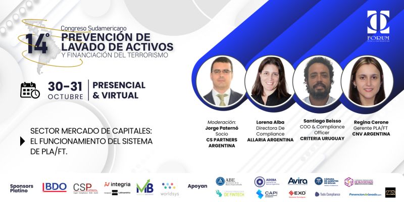 El pasado 31 de octubre de 2024, tuvimos la oportunidad de moderar el bloque “Sector de Capitales: el Funcionamiento del Sistema PLA/FT”, en el 14º Congreso Sudamericano de Prevención de Lavado de Activos y Financiación del Terrorismo organizado por FORUM Foros y Conferencias para la Capacitación Corporativa y dirigido por Alberto Rabinstein, que se llevó a cabo los días 30 y 31 de octubre. Este evento reunió a expertos, profesionales y autoridades de toda América para discutir los desafíos y las mejores prácticas en la lucha contra estos delitos. Cada sesión ofreció perspectivas únicas y enriquecedoras, lo que permitió profundizar en el funcionamiento del sistema de prevención y su impacto en nuestra región.